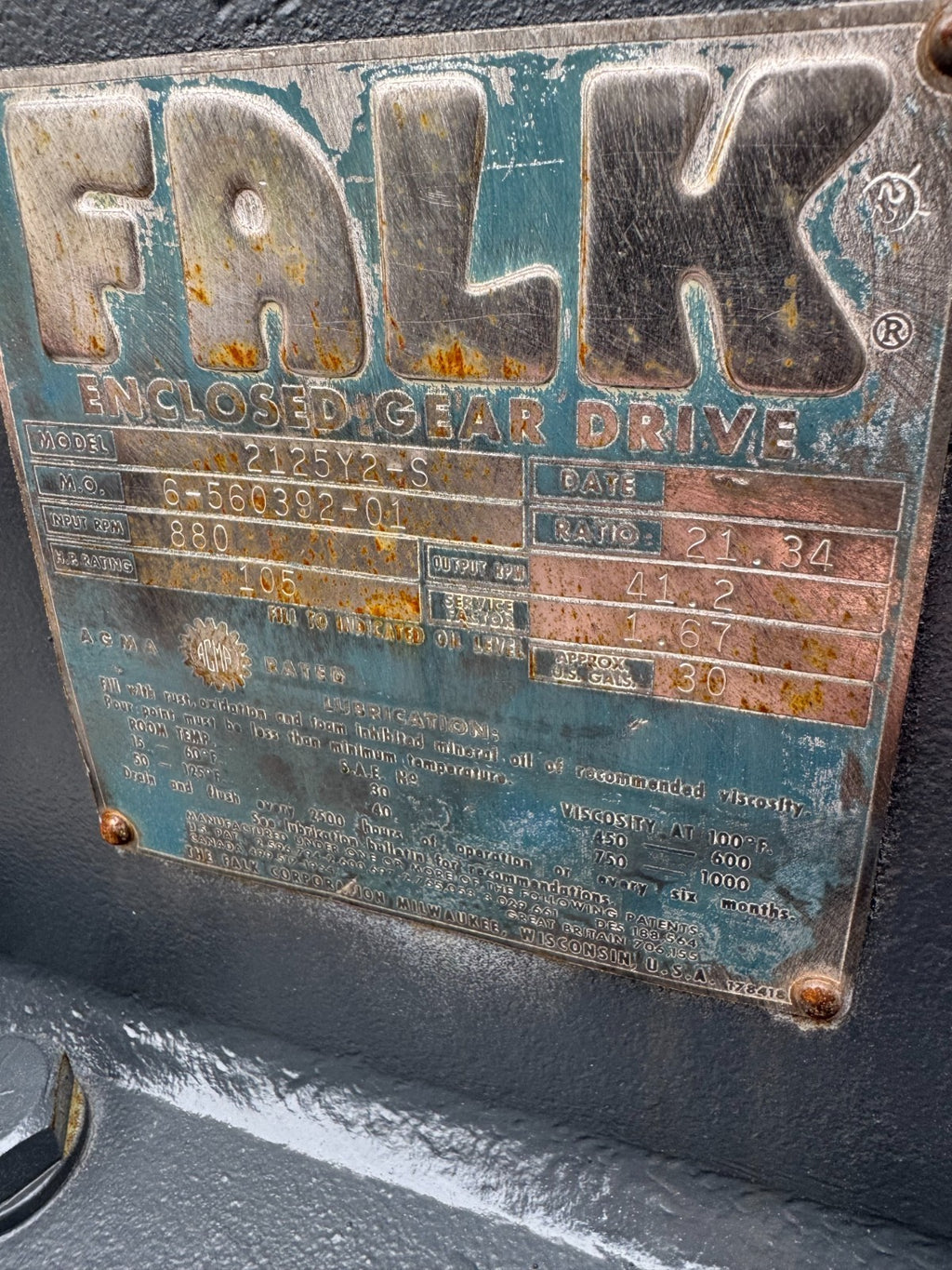 FALK 2125Y PARALLEL SHAFT ENCLOSED GEAR DRIVE SPEED REDUCER 21.34 RATIO 2125Y2-S