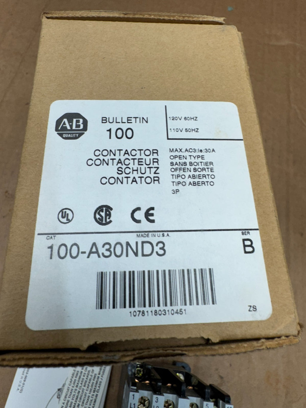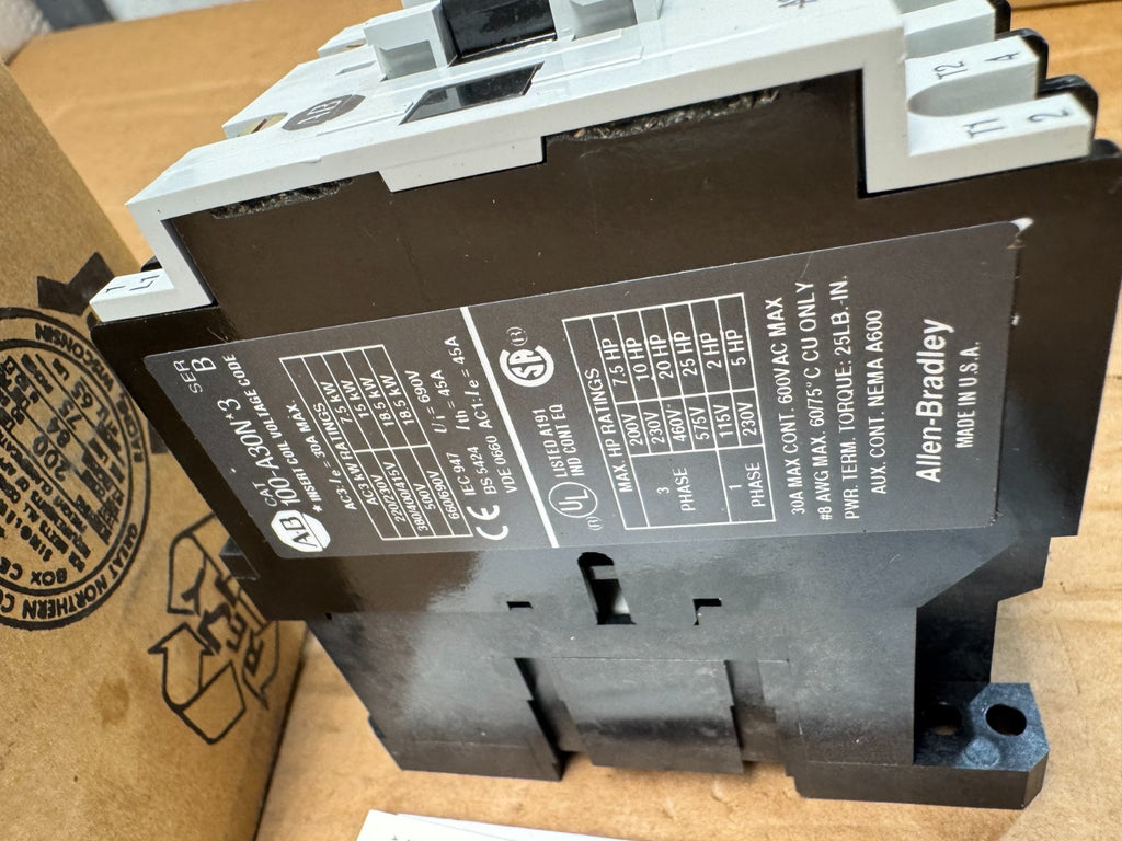 NEW IN BOX ALLEN-BRADLEY CONTACTOR 110/120V. COIL 100-A30ND3 SERIES B