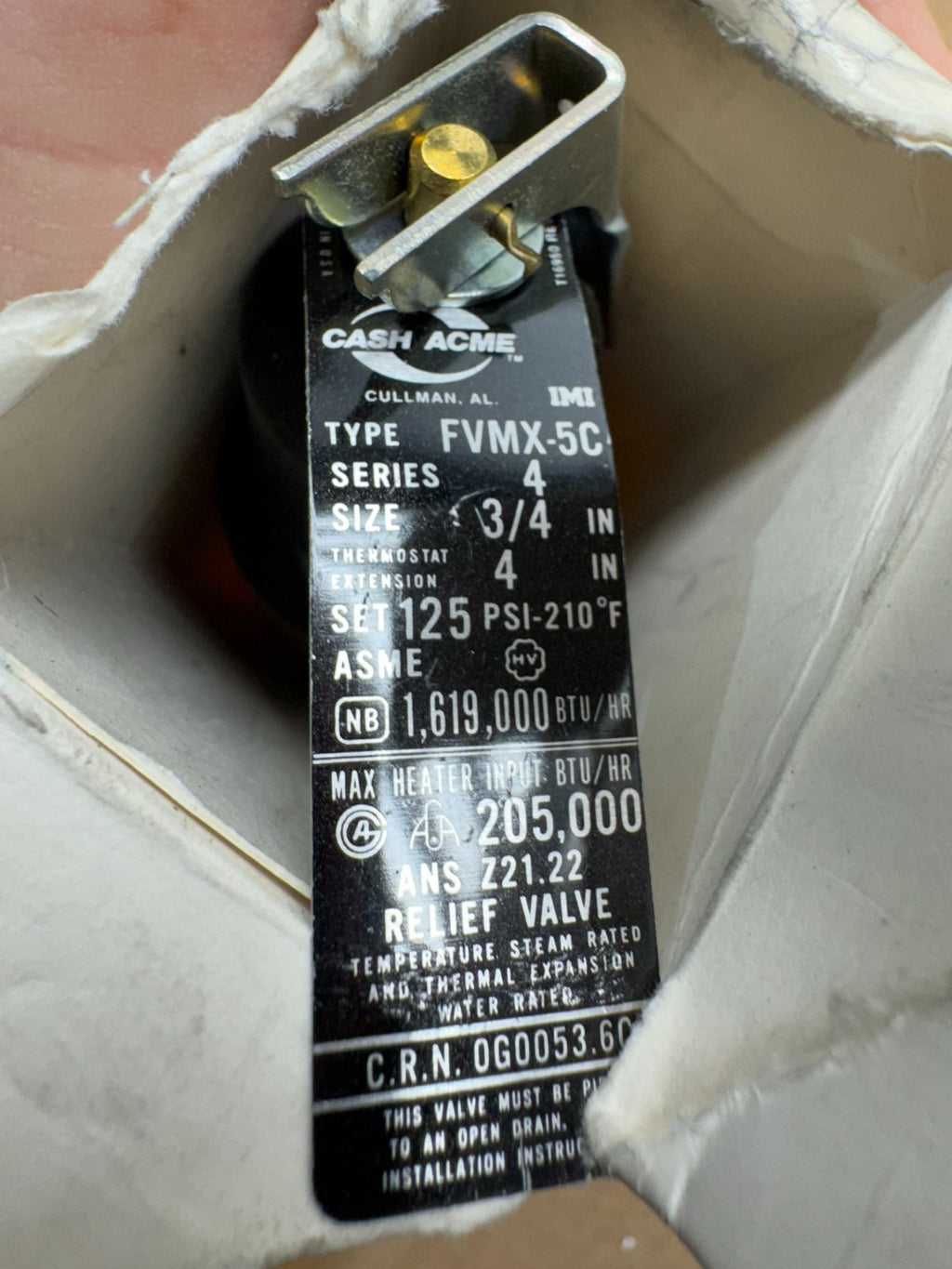 NEW IN BOX CASH ACME 3/4" PRESSURE RELIFE VALVE FVMX-5C