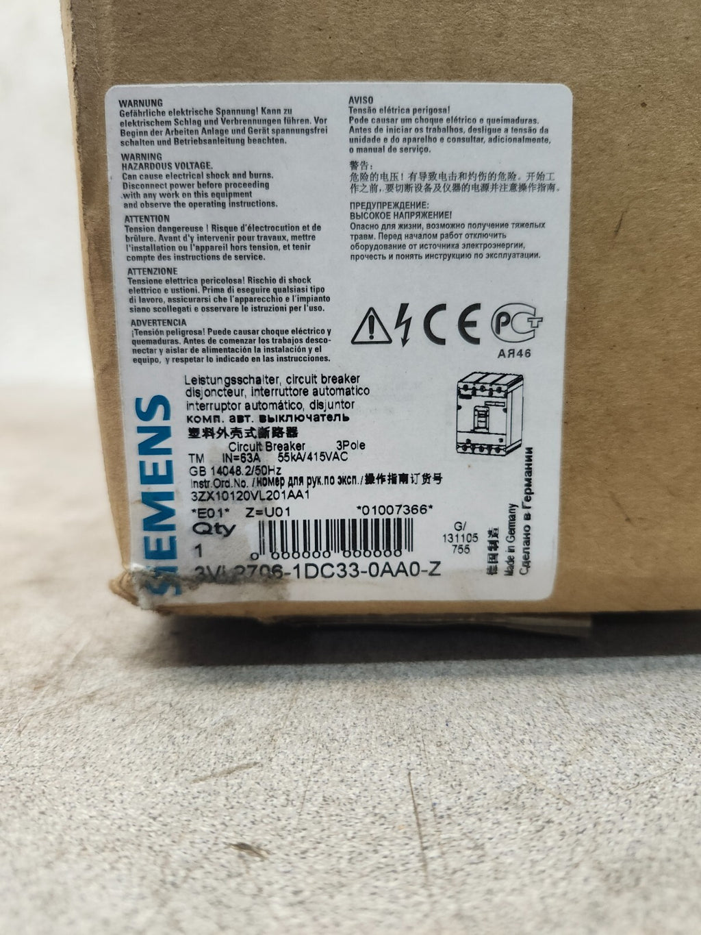 NEW IN BOX SIEMENS CIRCUIT BREAKER 50-63 AMP, 3 POLE, 3VL9206-7DC30