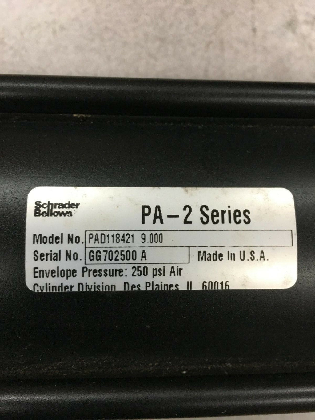 NEW NO BOX SCHRADER BELLOWS PA-2 SERIES CYLINDER PAD118421 9.000