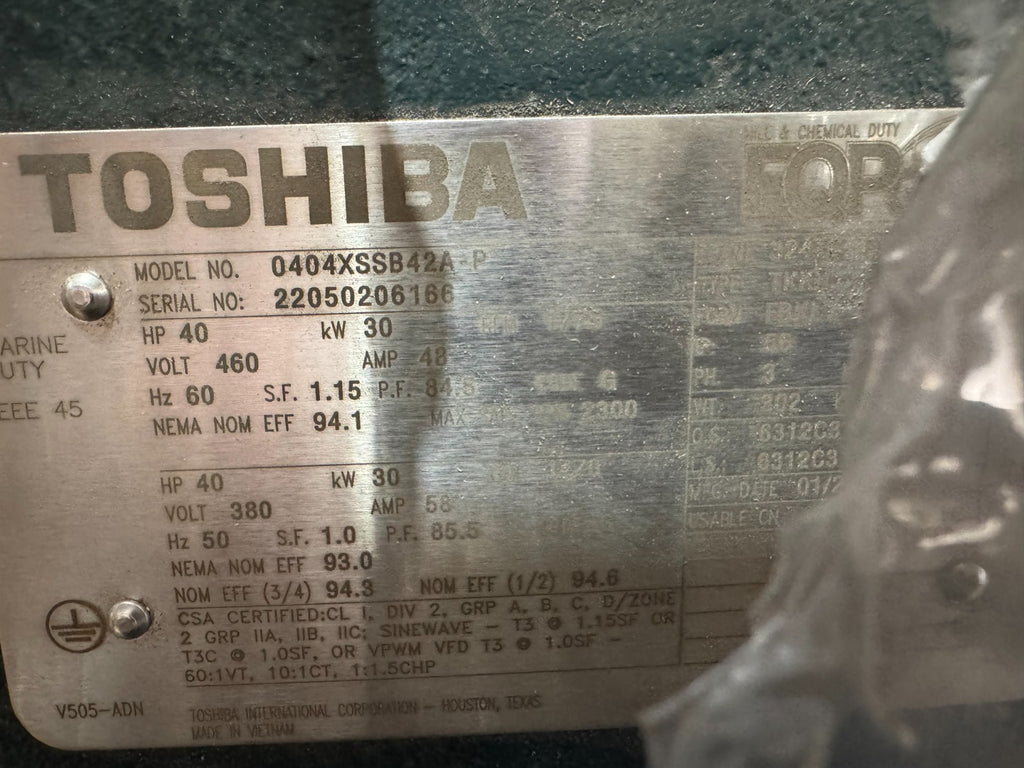 NEW TOSHIBA 40HP 460V. ELECTRIC MOTOR 1775RPM 324TC FRAME 0404XSSB42A-P