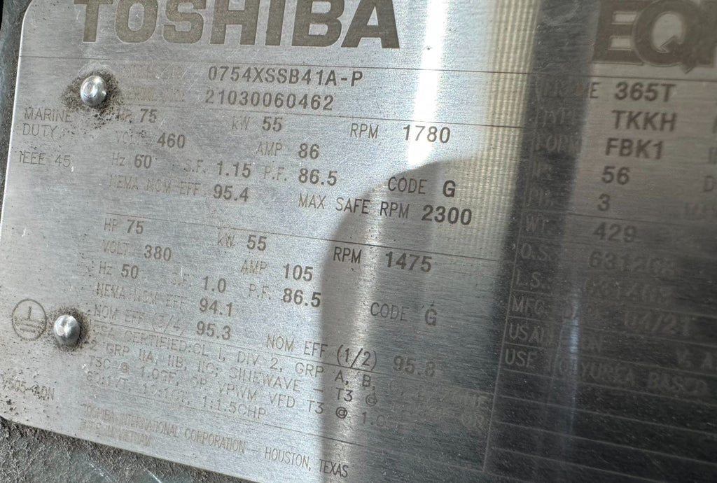 NEW TOSHIBA 75HP 460V. ELECTRIC MOTOR 1780RPM 365T FRAME 0754XSSB41A-P