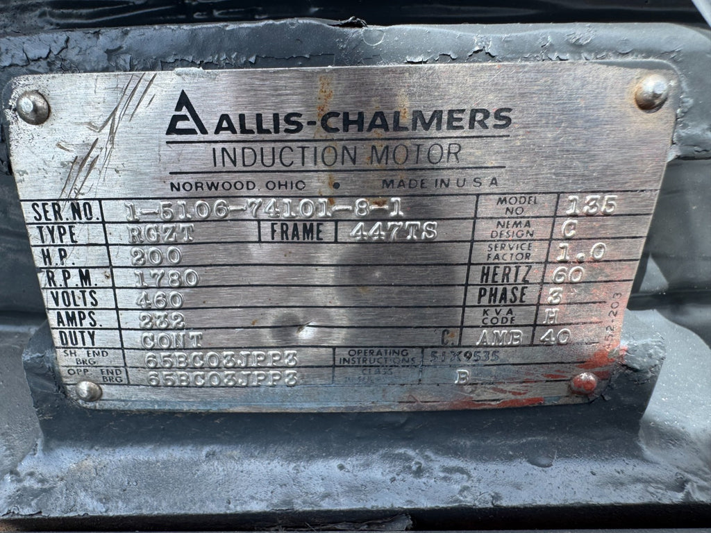 REBUILT ALLIS-CHALMERS 200HP 1780RPM ELECTRIC MOTOR 460V. 447TS FRAME TYPE RGZT