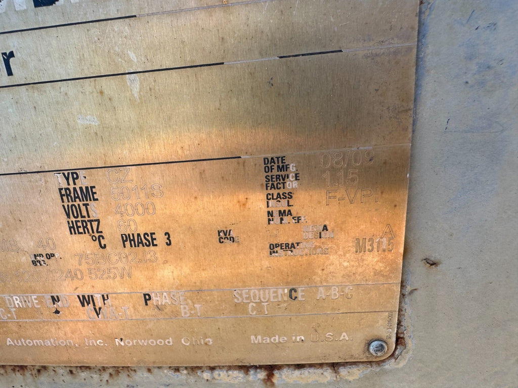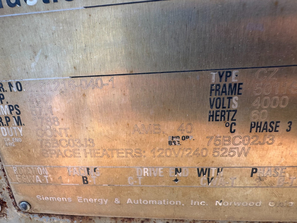 USED SIEMENS 400HP 1788RPM ELECTRIC MOTOR 5011S FRAME 4000V. TYPE CZ