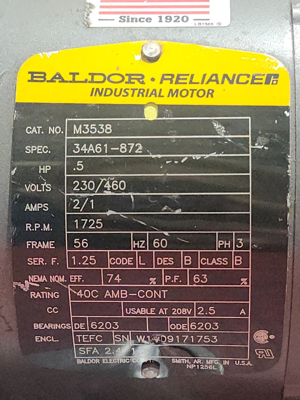 USED BALDOR INDUSTRIL MOTOR .5HP, 230/460V, 2/1 AMPS, 1725RPM, M3538 34A61-872