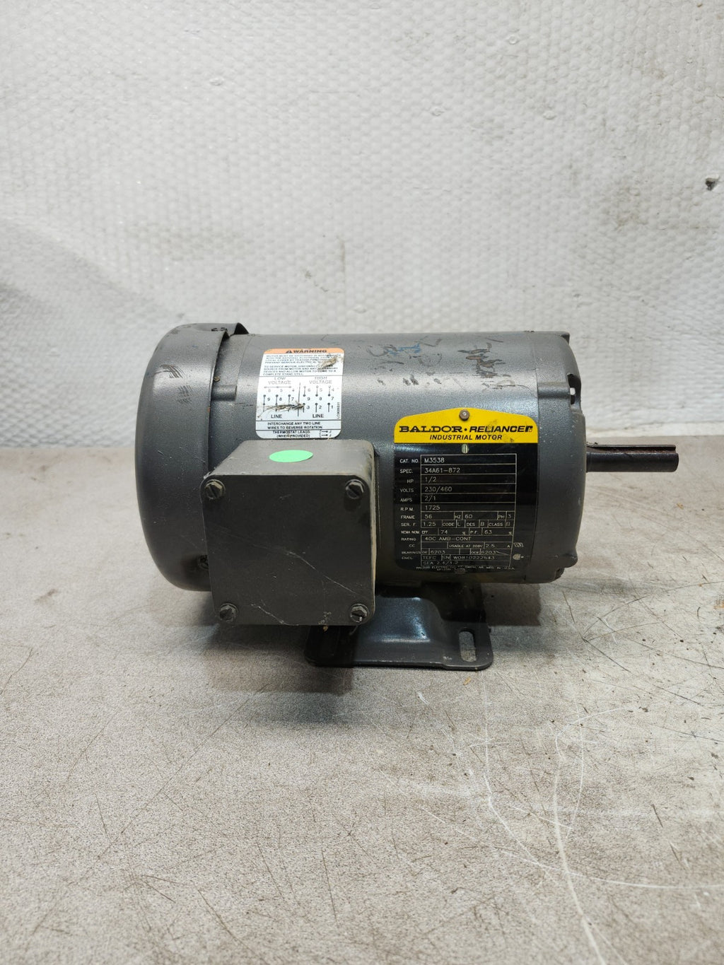 USED BALDOR RELIANCE MOTOR HP 1/2, 230/460V, RPM 1725, 3PH, 60HZ, M3538