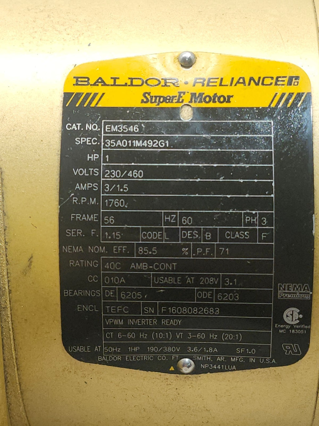 USED BALDOR RELIANCE MOTOR HP1, 230/460V, 3/1.5AMPS, 1760RPM, PH3, EM3546