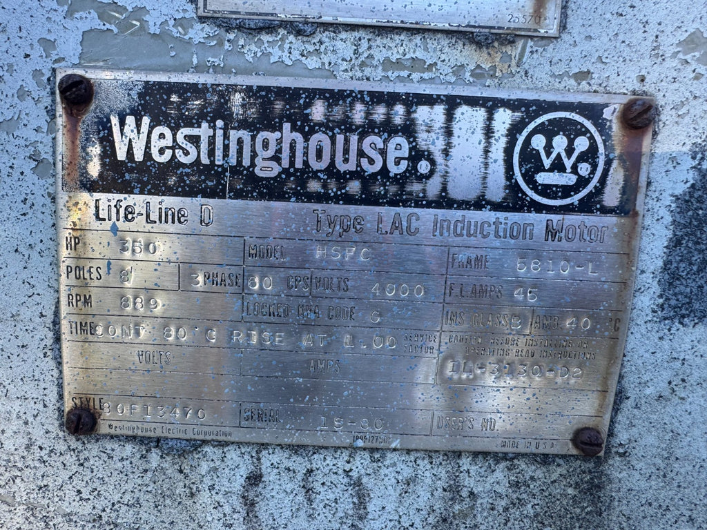 USED WESTINGHOUSE 350HP 889RPM ELECTRIC MOTOR 5810-L FRAME 4000V. MODEL HSFC